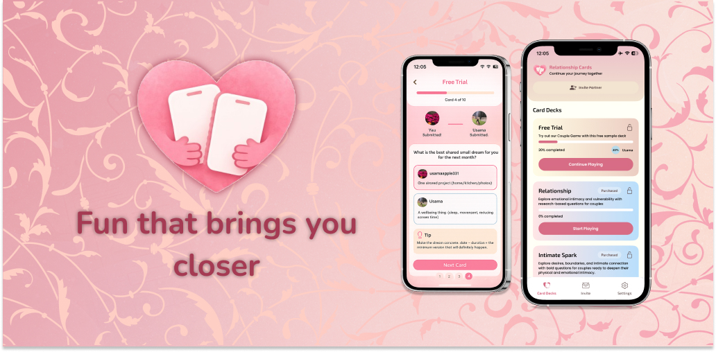 The questions in the decks are created with the help of artificial intelligence (AI). Their themes and structure are based on publicly available relationship research and therapeutic practices. AI has been used to analyze a large amount of data so that the card questions fit into couples’ everyday lives and help start conversations. Couple Game is not therapy. It is a game that opens conversation and increases connection between partners.